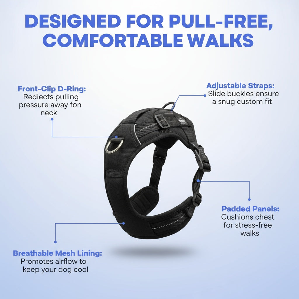 • Front-clip D-ring for gentle guidance • Padded breathable mesh lining to reduce rubbing • Durable hardware to withstand everyday wear